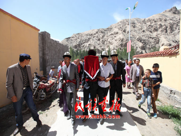 乌尔都隆窝孜村离乡政府不远,到达这里时,两排土黄色的牧民新居与远处的昆仑山已经让我们感受到浓浓的别样风情。其中一户门前人头攒动,聚满了很多人。不用说,这里就是举办婚礼人家的住处。