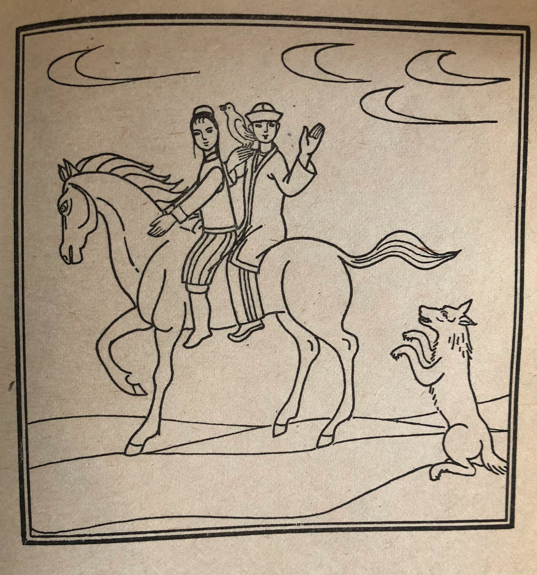 汗想坐得靠近那个美女一点儿,可是,他刚往前一凑,美女一下子变成了狼,上去把汗抓了个头破血流,然后很快地跑掉了。狼又从后面赶上了少年和那位姑娘。少年又对狼说:“我也不想跟这匹马分开了,能不能想个办法呢?”狼说:“可以。”在回到第一个汗的附近时,狼又摇身一变,变成了一匹骏马。少年牵着骏马送到汗那里。汗回谢以后,就给了他那只金丝鸟。少年带着金丝鸟和姑娘一起骑上马又走了。
