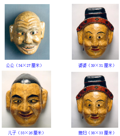 面具,土族语称“面古子”,是土族在表演某些仪式舞蹈时用以表现一定内涵的道具。按形制可分为假面和假头两大类。其中最具代表性的当属“纳顿”节日当中使用的面具。民族文化宫博物馆珍藏了三组土族“纳顿”面具,分别为表演“庄稼其”时的公公、婆婆、儿子、媳妇的假面面具;表演“杀虎将”时的杀虎将、虎、猴、牛的假面、假头面具;表演三国演义人物关羽、张飞、曹操、吕布的假面面具。面具材质均为布胎, 20世纪80年代征集于青海省海东市民和回族土族自治县。