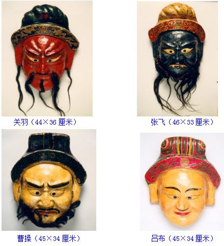 反映三国内容的舞蹈有“五官”“三将”“五将”“关老爷”等内容。面具角色有刘备、关羽、张飞、曹操、吕布等。表演动作疾缓有序,再现了三国时骁将驰骋疆场的场面。