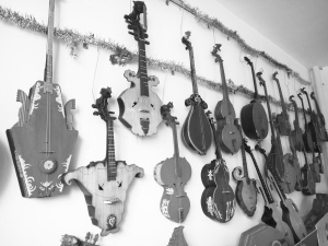 何晓制作的东布尔各具形态,其中融合了其他民族乐器的特点。