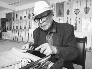 4月里一个春光明媚的日子,在新疆察布查尔锡伯自治县老干局的一间活动室里,年已古稀的锡伯族老人何伊尔·何晓正在打磨木料,他的神情专注而认真。在他身后的墙上,挂着30多把由他亲手设计、制作的形状各异的东布尔。而这间十几平方米的活动室俨然成了一个小型的东布尔展厅,各种有关东布尔的文字介绍、图片展示一应俱全。