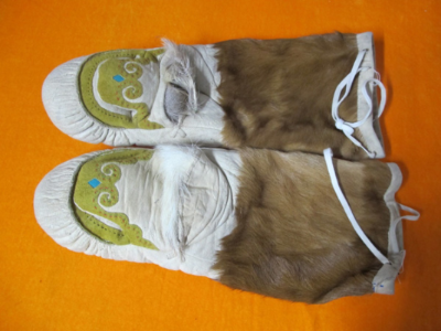 此外鄂伦春人还有被称为“瓦拉开依”的手套,它和北方人做的棉手闷子一样,是拇指同其他四指分开的手套,手心处无开口,戴这种手套可以保暖,也可以拿比较笨重粗大的东西,但不能射猎。另一种被称为“沙拉耶开依”,是五指手套,即五指分开,戴这种手套拿东西或射击都很方便,但保暖性能差,多为青年人喜爱和佩戴。鄂伦春人冬季出猎,一般还是喜欢戴“考胡鲁”。以上三种手套多用狍皮制作,五指分开的手套也有用鹿皮制作的。