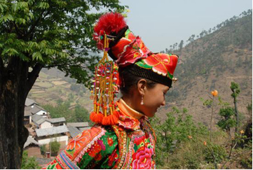 云南巍山彝族回族自治县各民族如壮丽的织锦,将生活装扮得五彩缤纷,充满诗情画意。其中特别是东山一带的彝族服饰色彩较为丰富,款式变化多姿,并且以大量的银制品和刺绣装饰,制作工艺之精良,堪称少数民族服饰一绝。以小孩帽而言,就有鱼尾帽、小瓢帽、银鼓帽、花帽和搭耳帽等数十种,名目繁多,式样各异。帽子上都绣有花草、树叶、龙凤图案,镶嵌着闪亮的银首饰,十分逗人喜爱。小孩的衣服式样也很多,大多由红、蓝、绿、白几种颜色的布料缝制而成,红绿交织,蓝白相衬,非常艳丽。如花朵一般的彝族少女通常头戴银鼓帽,坠耳环、身穿蓝领褂,腰系花围裙,下着绿彩裤,背挂圆裹背。银鼓帽和绣花鞋做工极为精巧,全套装饰花团锦簇,恰似一只开屏的孔雀。结婚后的妇女就不再戴帽子,改为结发髻,裹包头。发髻一般呈宝塔状,外裹黑纱和黑布包头,发髻上戴“别子”。“别子”其实就是发卡,均为银制品,分为四串,每串有两个灯笼绣球,两个响铃和两尾小鱼。包头巾外再用银串珠、亮球饰之。上衣着右衽大襟,前短后长、领、袖及襟边则镶以多层不同的金银丝瓣或自绣花纹的多层宽窄不同的花边。外罩齐腰蓝布短领褂,领口上安装着七个用银鼓钉凑成五个叶子,状如葵花形,彝语叫“披巴”的装饰。领褂四周皆用银鼓钉镶边,共四排,每排36颗。一件领褂上需有两百多颗银鼓钉,加上胸前佩戴银制的“三须”针筒,“菱角吊”串珠和鸡心型绣花荷包,整个装饰真是银装素裹,分外娇娆。腰间系的围腰布上,镶嵌多层金银丝瓣或自绣图案的花边。图案有串枝莲、牡丹花、太阳花及凤戏牡丹、丹凤朝阳等。无论未婚和已婚妇女,背上都有一个用羊毛擀制而成的圆型绣花裹背,直径约一尺不等,内外两层,中可承物,上绣两对太阳花,一大一小,对称排列。裹背除用作装饰外,还可保护腰部,既有欣赏价值,又有实用价值,这在巍山彝族服饰中是最为典型的一件饰物。银鼓帽绣有42朵小花,镶有96颗银鼓钉,帽顶插有花一朵或钉有樱花一束。其帽形如金鱼,鱼头鱼身为帽,鱼尾多岔分为护颈,亦称为“鱼尾帽”。绣花鞋呈船形或凤头形,鞋面绣有40余朵小花,红色中夹有40余片绿叶。如果是新娘鞋,则用红色或粉色的软锻做鞋面,更为讲究。