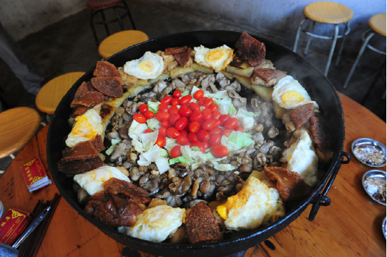 平坝凹锅更具特色,食材十分丰富,为了拍摄平坝凹锅小吃,我们一行来到当地人宗发英家开的勤发饭店,并被安排在二楼的里间。屋内正中支着一口平底铜锅,下面是烧着炭火的炉子。火很旺,不一会平底锅里的油便嗞嗞作响,主人把煎得黄黄的臭豆腐、豌豆粉等放到锅里,锅的中间加上一些蔬菜、小个西红柿,色彩非常漂亮,周围都放着一碗碗用喷香的辣椒面拌有湿蘸水和干蘸水。