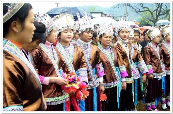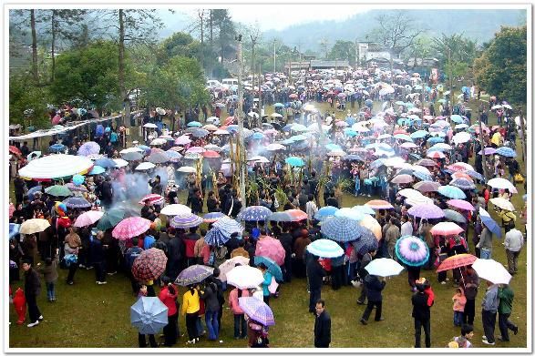 香粉古龙坡会于每年农历正月十六举行,所以又名“十六”坡。这一天、来自外国朋友、各地的游客及当地方圆十里的苗哥苗妹,提芦笙,提鸟笼、牵马匹,打花伞……朝着十六坡赶来。正午时分,山梁上、村道间、河溪旁,出现了成列成队穿红戴绿的人群。远远望去,似一条彩带在飘动。当万余人汇集后,整个坡地就成了彩色的世界。