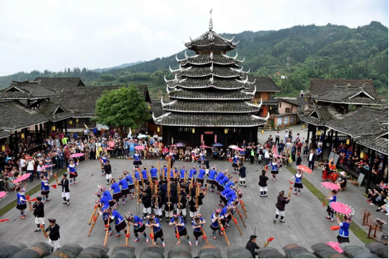 过年期间,各家各户姓氏轮流过节,亲朋好友都会集中前往,最后到鼓楼坪唱歌跳舞庆祝侗年。——程阳八寨景区