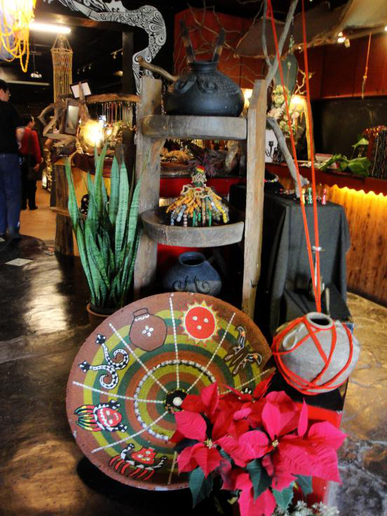 雕刻。高山族的雕刻以木雕和石雕为主,金属雕刻是现代才出现的。排湾和鲁凯两个族群的雕刻工艺最为发达,也最具特色。木板雕刻的纹样与石壁雕刻大致相似,只是木板雕刻多施色彩,少则红、白两种色,多则加上黄、橙、蓝、绿色不等,鲜艳亮丽,引人注目。一般住屋内外都有雕刻,贵族的住屋装饰尤其突出。立柱和壁板雕刻的主题多为叙述家族神话、传说起源或表彰家族的特殊事迹。雕刻的题材以神话传说、狩猎生活、祖灵像为主;木雕以人像、人头、蛇纹、野猪和鹿纹为主;其他还有重圆纹、太阳纹、网形、风车形,四叶形、人体生殖器等等。这些题材与排湾人的原始宗教、神话内容有密切的关联。住屋的木雕取材于质地坚硬的樟木、台湾榉、二叶松等乔木,而木桶、木臼、木椅等器物,除了坚硬木材外,也选择樟木,乌心石等。至于木匙、烟斗、木梳则喜欢用月橘之类的材质。