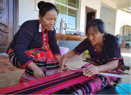西盟县翁嘎科镇班弄村农家院子里,佤族老技艺手工织锦县级传承人娜龙正在教徒弟娜药织布。