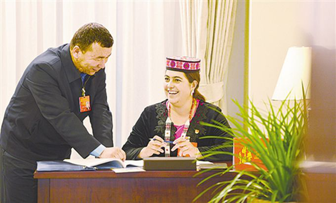 党的十九大新疆代表团驻地里,米日姑丽·艾克米汗和吾布力喀斯木·买吐送代表(维吾尔族)谈起五年来家乡的巨大变化非常开心,“百姓富了,家乡美了,来自全国的客人也多了” (高兴贵 摄影)