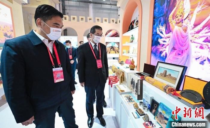 图为甘肃省副省长孙雪涛(左)与甘肃省文化和旅游厅厅长陈卫中(右)一同参观“甘肃馆”。 甘肃省文化和旅游厅供图