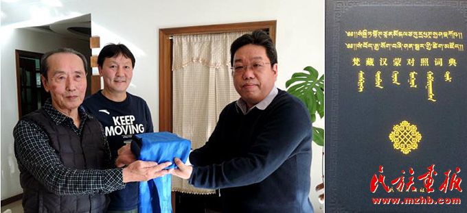 乌日根桑格(中)利用业余时间,与民族出版社蒙古文部原主任、资深编审卓日格图先生(左一)合作出版《梵藏汉蒙对照词典》。图为向学者赠阅该词典。