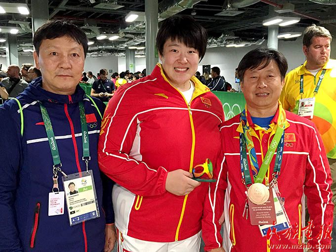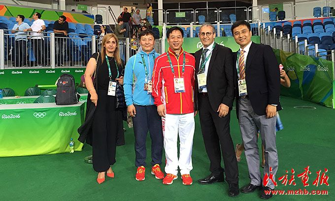 2016年,里约奥运会期间,乌日根桑格(左)与中国国家柔道队队员于颂(中)、国家柔道队原主教练程志山合影留念。
