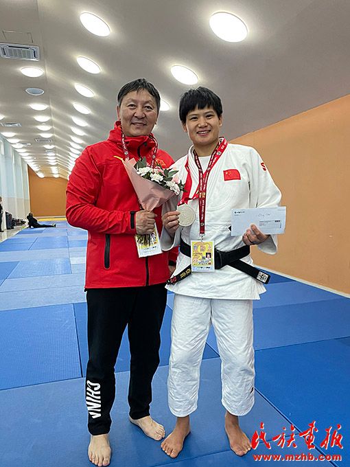 乌日根桑格(左)随国家柔道队参加 2021年世界柔道大满贯比赛。图为与国际级运动健将、国家柔道队队员杨俊霞合影留念。