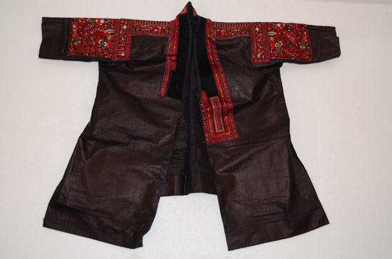 分布在凯里、雷山、丹寨、麻江四县交界地一带苗族村寨,以凯里舟溪苗族为代表。该服装上衣为缎面对襟衣,刺绣主要在肩袖及袖口部分,以黔东南苗族特有的茧片绣为主,所绣图案为浮萍花和几何纹,肩部和背部镶有银泡和银片,具有民族特点 。前、后围腰片均以茧片绣为主,所绣图案为浮萍花和几何纹。