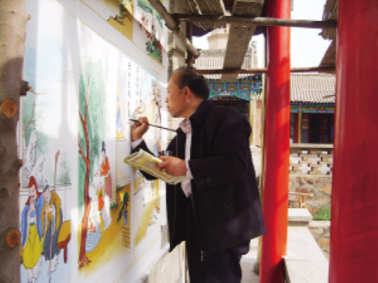 在以后的古建彩绘修缮中,陈进德不断深入磨炼技术。在彩绘技艺上,他按照建筑群体的不同结构,结合当地传统习俗,一般建筑外观以旋子如意彩画形式配彩,走廊采用苏氏混彩的艺术布局,突出艺术画廊的彩画特色,门扇格子以五彩形式沥粉配有画面,突出人物清高、山水大雅、花鸟活泼、博古清香、书法淋漓,既吐纳了当地的古建风格,又彰显了民族文化的积淀。除了注重彩画技艺,陈进德在颜色工料上也比较讲究。