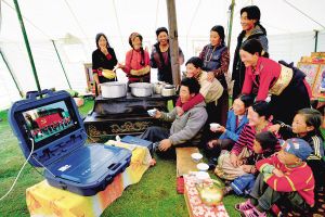 四川省甘孜州甘孜县卡龙乡卡龙村的牧民们高兴地在新型帐篷中通过移动电视收看节目。尹钢摄