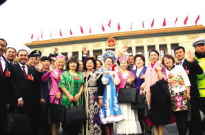 十三届全国人大一次会议开幕前,少数民族代表身着盛装,在人民大会堂前留影。 本报记者 张国欣摄