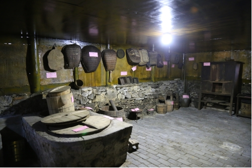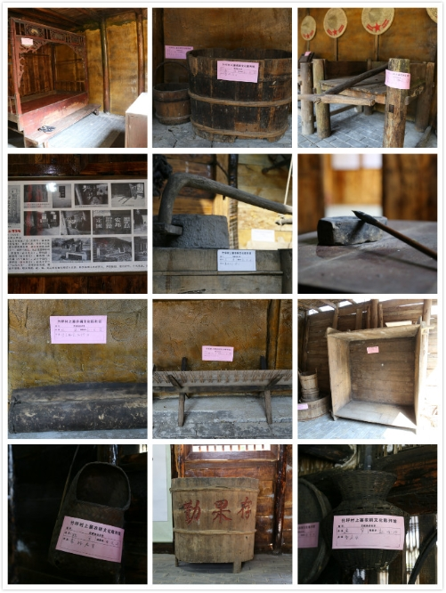 “农耕文化陈列馆”是由两栋传统的木质民房改建,从大门进来,门的两边放置有农具,右侧一个是存储粮食的仓库,沿着仓库边上的石阶往上走,从小门进去,大大小小的簸箕、饭甑、猫箩、鱼箩等农具应有尽有。