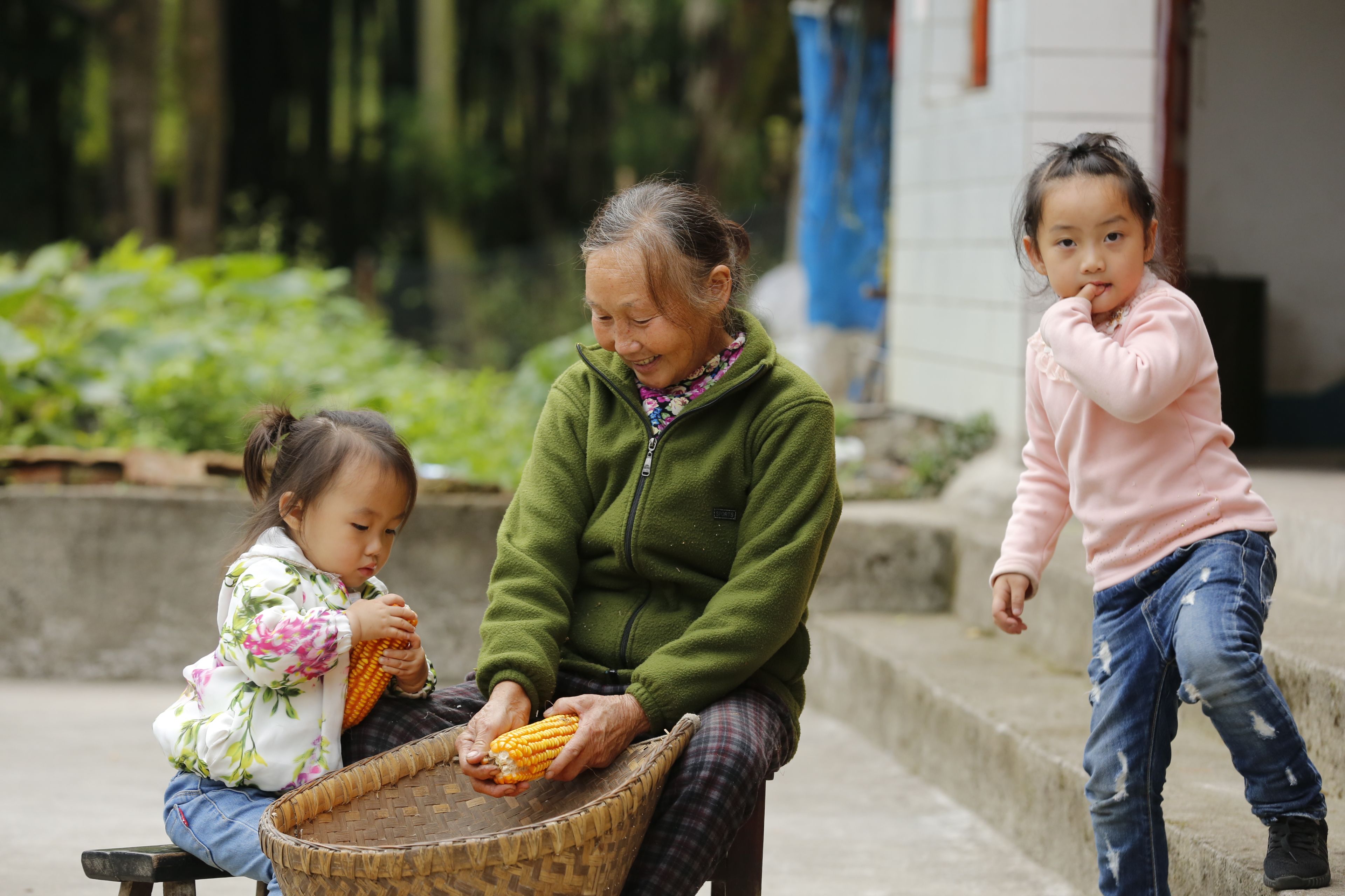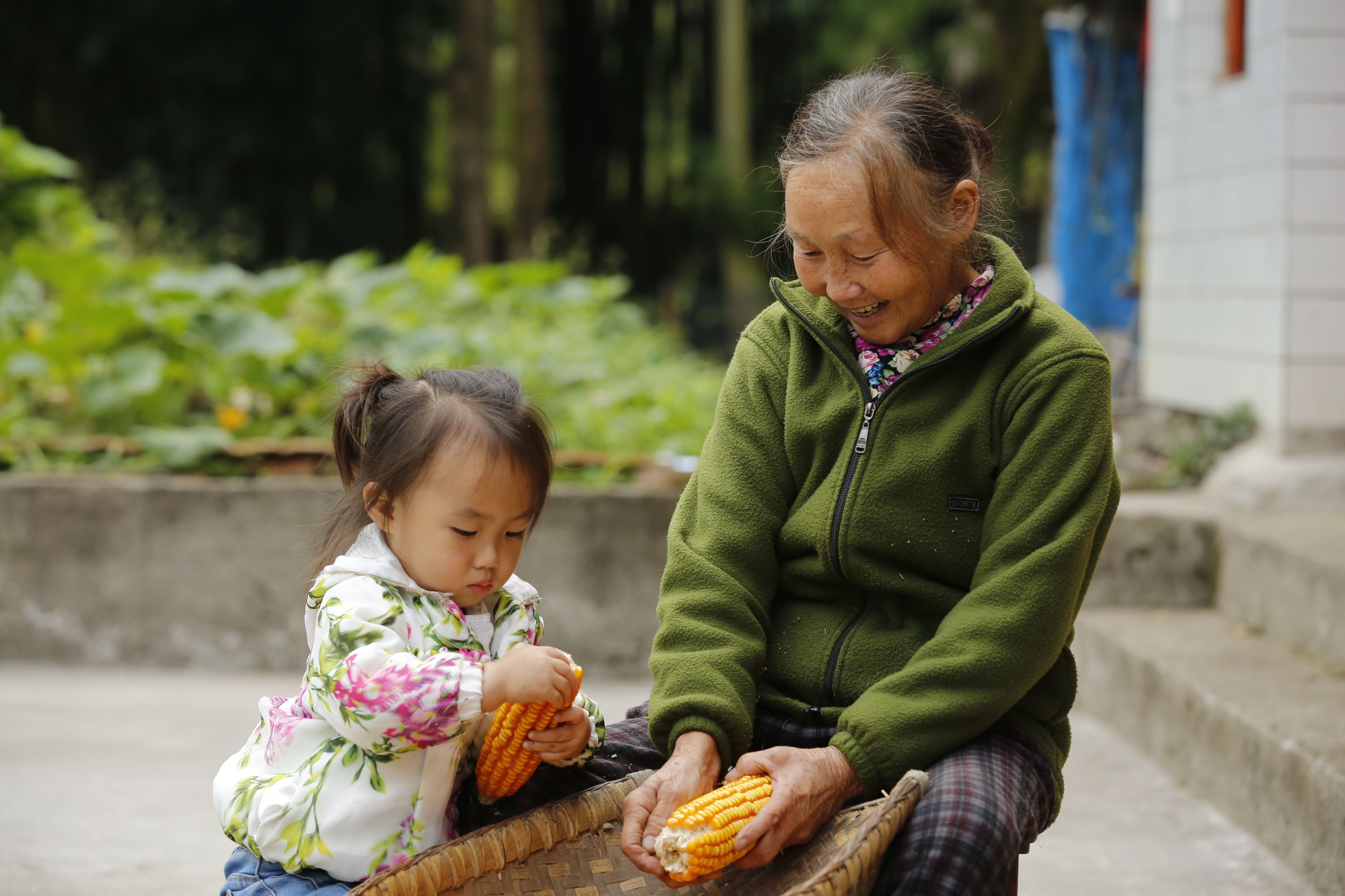 贵州贵阳苗族日常生活-老年人与儿童剥玉米